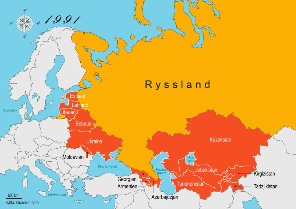 Efter Sovjetunionens upplösning 1991 förklarade sig flera Sovjetrepubliker självständiga. Det är den kartan Putin vill rita om.