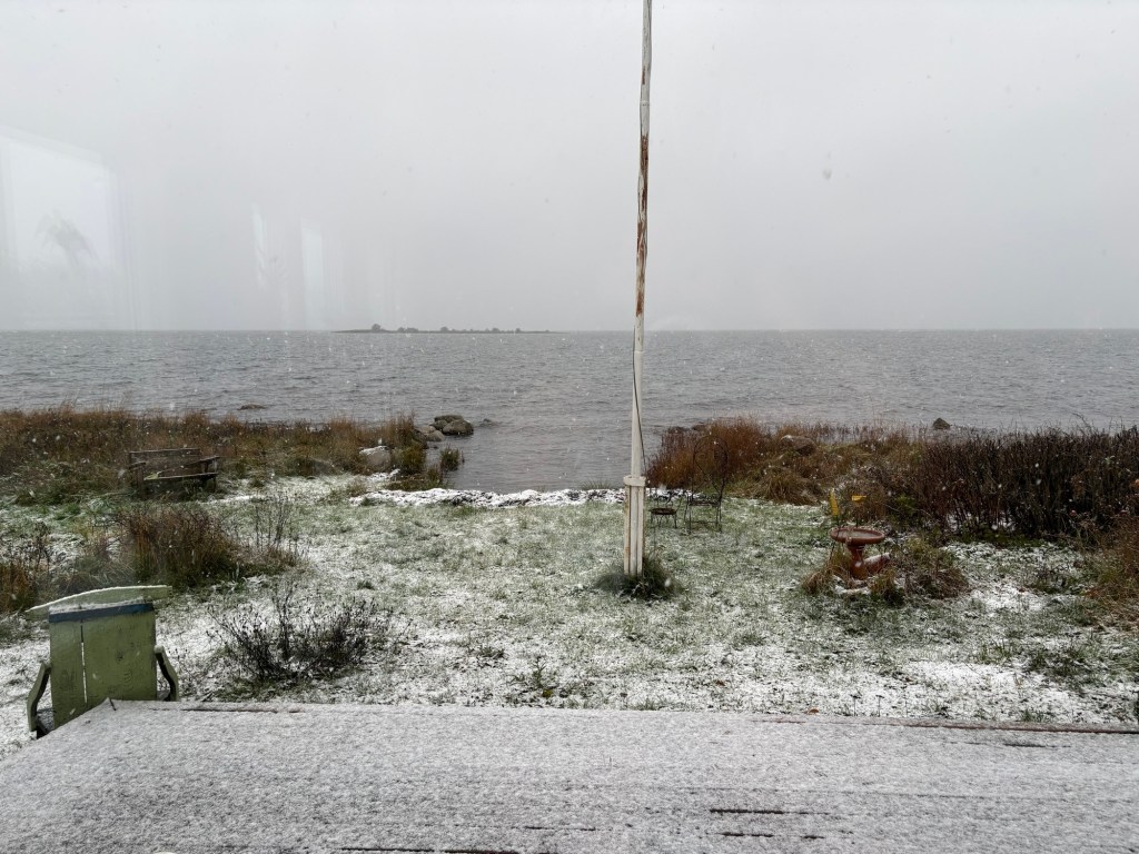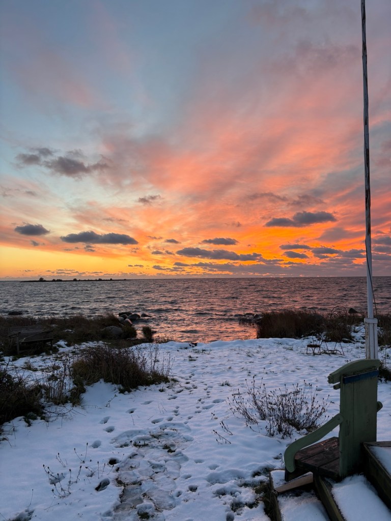 Han: Snön förändrar ingenting, ponnyexpressen måste fram även om hon får gå till kiosken för att hämta morgontidningarna. – Det behöver sägas: det är självvalt. Jag sköter frukosten. Och fotograferar ännu en vacker morgon på udden.