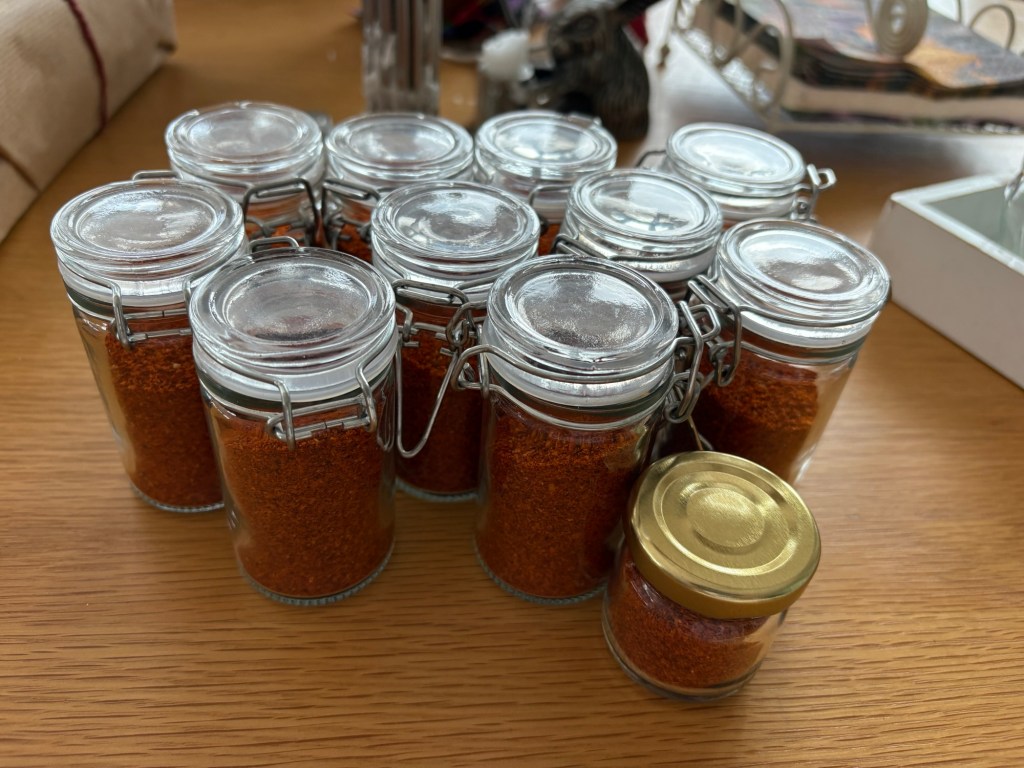 Hon: och så var årets första chiliblandningar malda och förpackade. Espeletten blir exklusiv i år, endast tio burkar blev det allt som allt.
