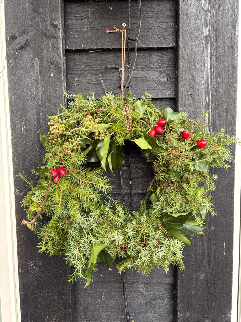 Egenhändigt tillverkad julkrans är också upphängd. Ja jag vet, jag har inget tålamod, så den blev lite punkig även i år. Men inget fel på jul–punk.