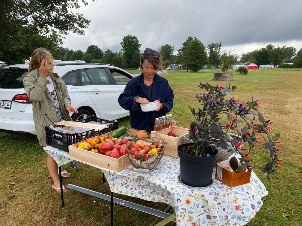 Är så lycklig över att vara tillbaka och gå runt och fixa med de nedrasade tomatplantorna (var hård vind när vi var borta…), skörda och småäta lite under tiden. Klippa bort vissna grenar och ruttna tomater. Ja det går fort och händer mycket på fyra dygn. Först blev jag förskräckt, men snart såg jag inte de tydliga hösttecknen längre, bara det vackra som att rosorna är på gång igen till exempel…