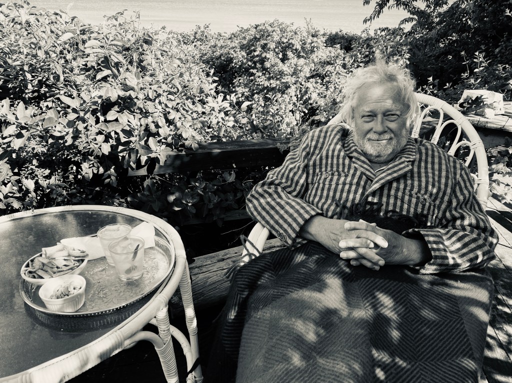 Han: Även jag medger att idag är vädret trist. Småregn, flugor i köket. En champagnedrink i väntan på bättre tider. – Eller lugnet före stormen? Inte alls, bara i väntan på barnbarnen Kasper och Emil som snart bör vara här tillsammans med sina föräldrar. Skafferierna är välfyllda. Vi har varit på Rökeriet i Brömsebro och köpt fisk, räkor och ost. Jordgubbar och ägg hos Ola, bonden. Självbetjäning som det är på landet.