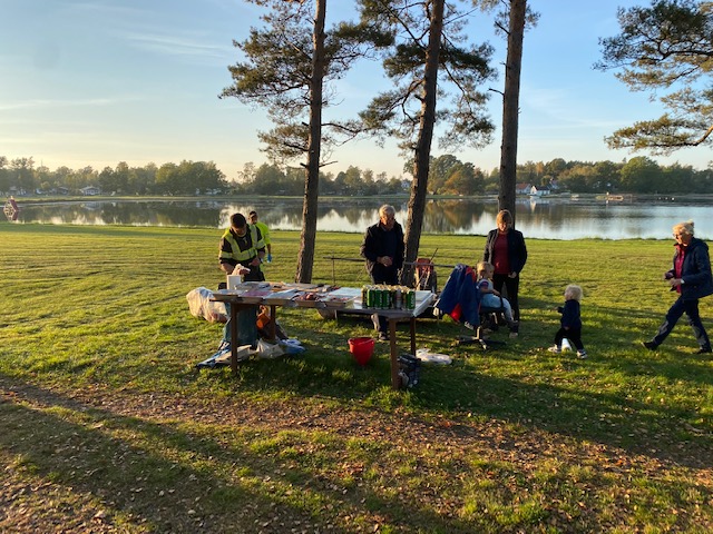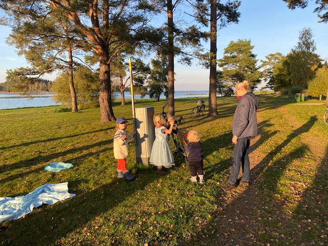 Han: Brittsommaren fortsätter på udden. Tio grader varmt, sol, bleke. Svanarna trivs och vaktmästaren hedrar vilodagen genom åka till vår tids kyrka, återvinningscentralen, för att lämna ännu ett lass med ansade björkar och gulnande löv.