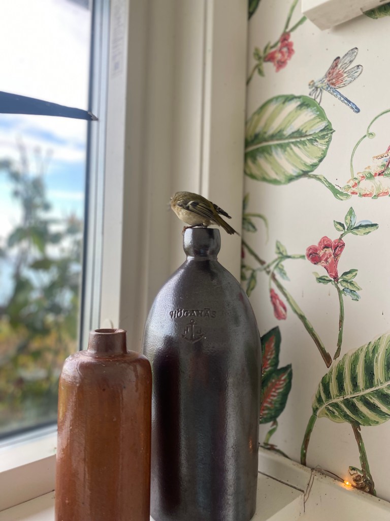 Den här besökaren kom in genom den öppna verandadörren, Ironiskt nog hade jag just satt upp en mobil (”Flygande Kerstin”) där nu fyra kungsfåglar försökt flyga in genom fönstren: