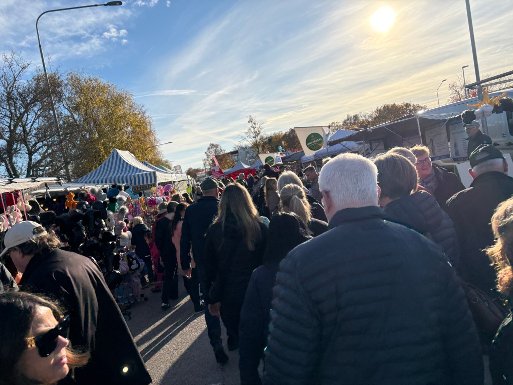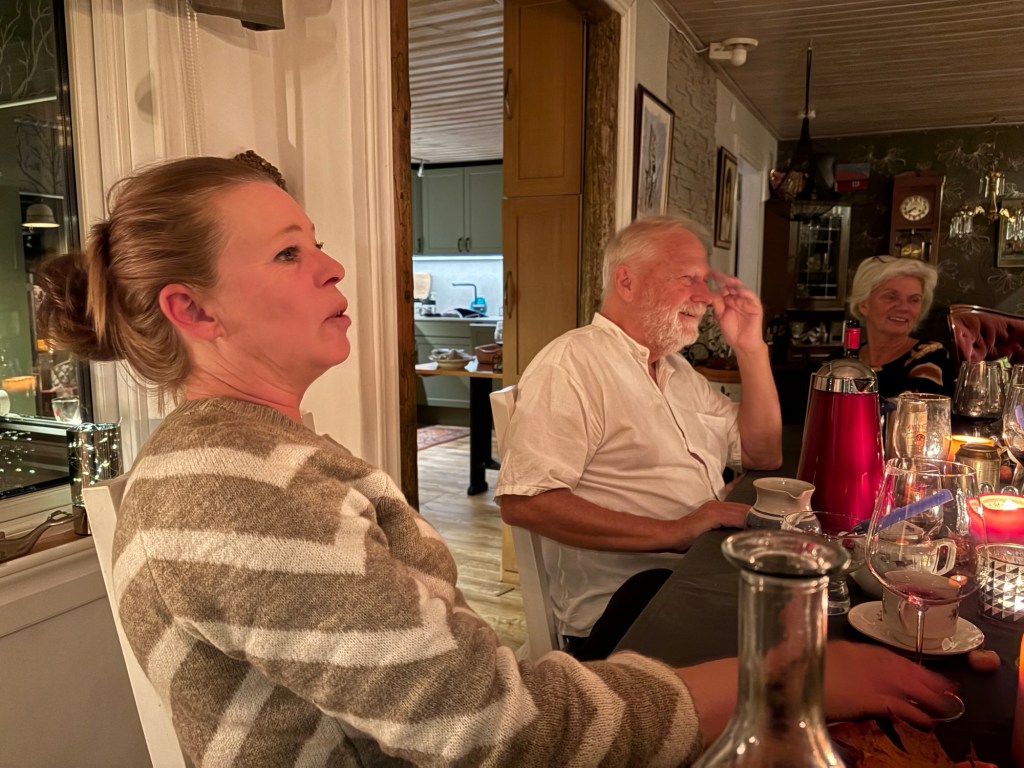 Han: … och som om inte allt detta vore nog! Dessutom har vi firat Torsås Nationaldag.Denna årliga Marknad med stort M, när hon går i barndom (om än med solglasögon) och vi därför alltid först tränger oss fram till ståndet med Mariannelunds konfektyr.