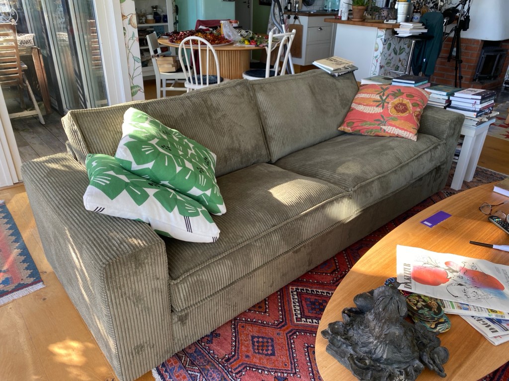 Så när två gröna manchester-soffor dök upp i en annons för Stalands möbler (som vi bodde grannen med på Söder i Stockholm) i DN förra helgen slog vi till.