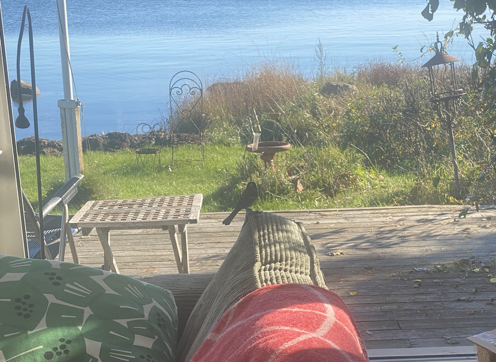 Han: Vi börjar från slutet på dagen. Så här låter tystnaden en kväll på udden i oktober. I övrigt har det varit en händelserik dag. – Först fick vi oväntat besök. En talgoxe undrar hur vi hade det inne hos oss med de nya sofforna och kanske nåt annat. – Det tog ett tag att vi kom överens om att hen nog trivdes bättre ute i naturen.