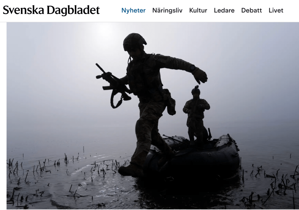 Faximil ur SvD: Ukrainska soldater i en båt på floden Dnepr nära Cherson i södra Ukraina, det område där Ryssland nu anklagas för att fejka segrar på slagfältet.