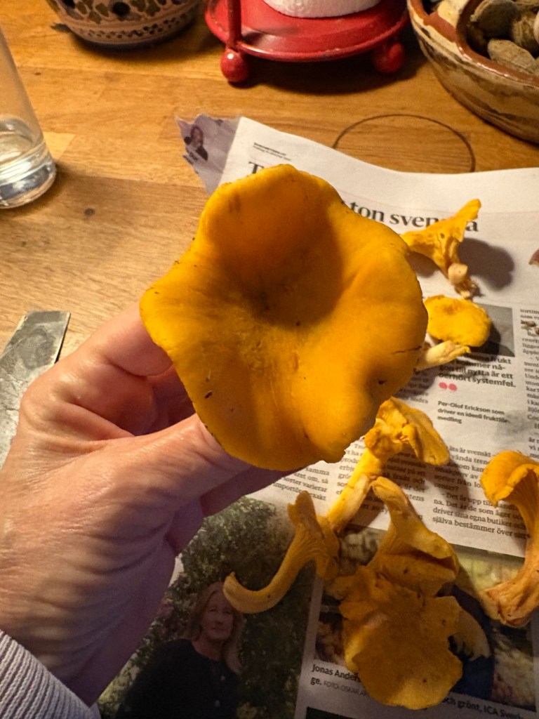 PS: Det finns fortfarande gula kantareller i närområdet. Kompisen Ancy i grannhuset och jag hittade några riktiga giganter på vår söndagspromenad. Var? Hemligt ;).