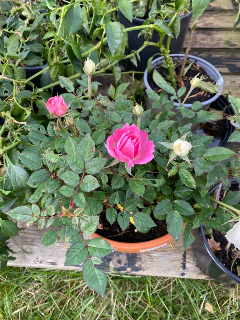 Han: För tre veckor sedan, efter köldknäppen, blommade vår sista ros i sin kruka. Det vill säga, vi trodde att det var en sista symbol för att sommaren är slut. – Det var det inte. Fortfarande tre veckor senare blommor den fortfarande. Och inte bara den. Idag, 4 november 2025, blommar även hennes engelska doftros på sjösidan: