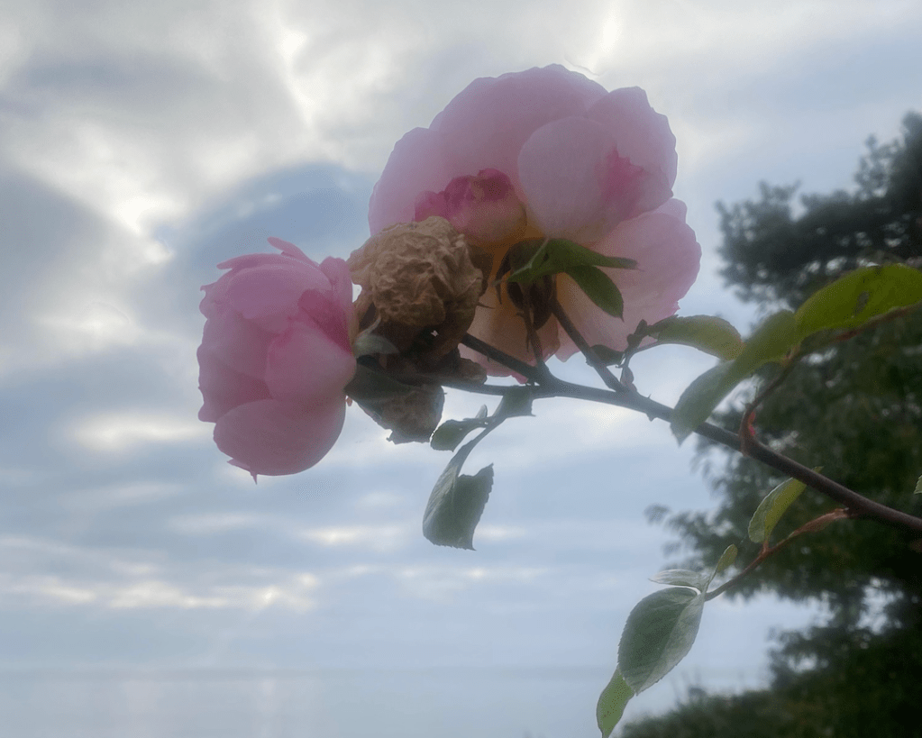 Jag blir överraskad av synen, uppsynen. Det är flera veckor sedan hon klippte ner rosensnåret mot havet. Inga rosenknoppar borde ha överlevt den massakern. – Men jag borde inte ha blivit överraskad.
