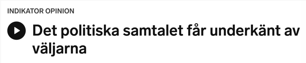 Han: För femtioelfte gången visar en opinionsmätning att svenska folket gör tummen ner för det politiska käbblet. Enligt Indikator Opinion tycker 7 av 10 att det politiska samtalet varken är respektfullt eller präglas av en vilja till samarbete. – Åtta av 10 instämmer helt eller delvis i att det politiska samtalet handlar mer om strategi och spel än som sakfrågor liksom att det präglas av smutskastning partierna emellan.
