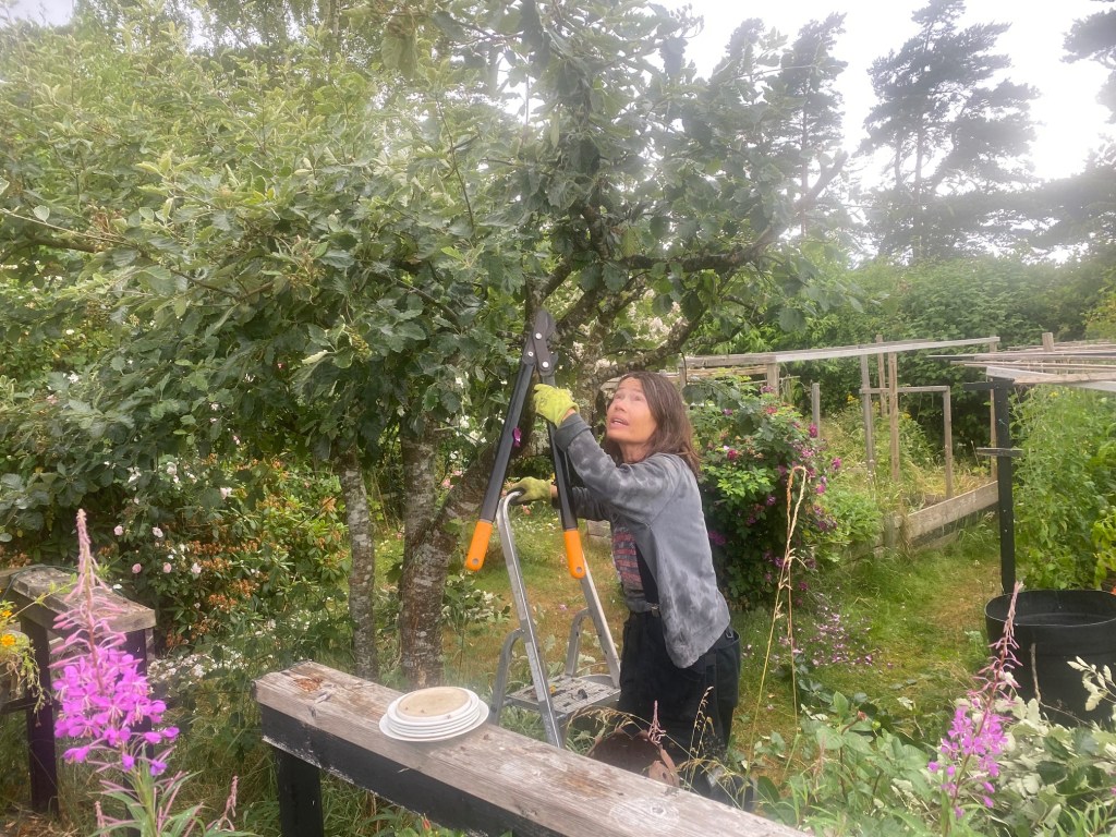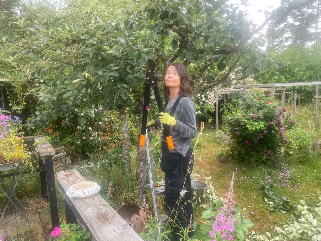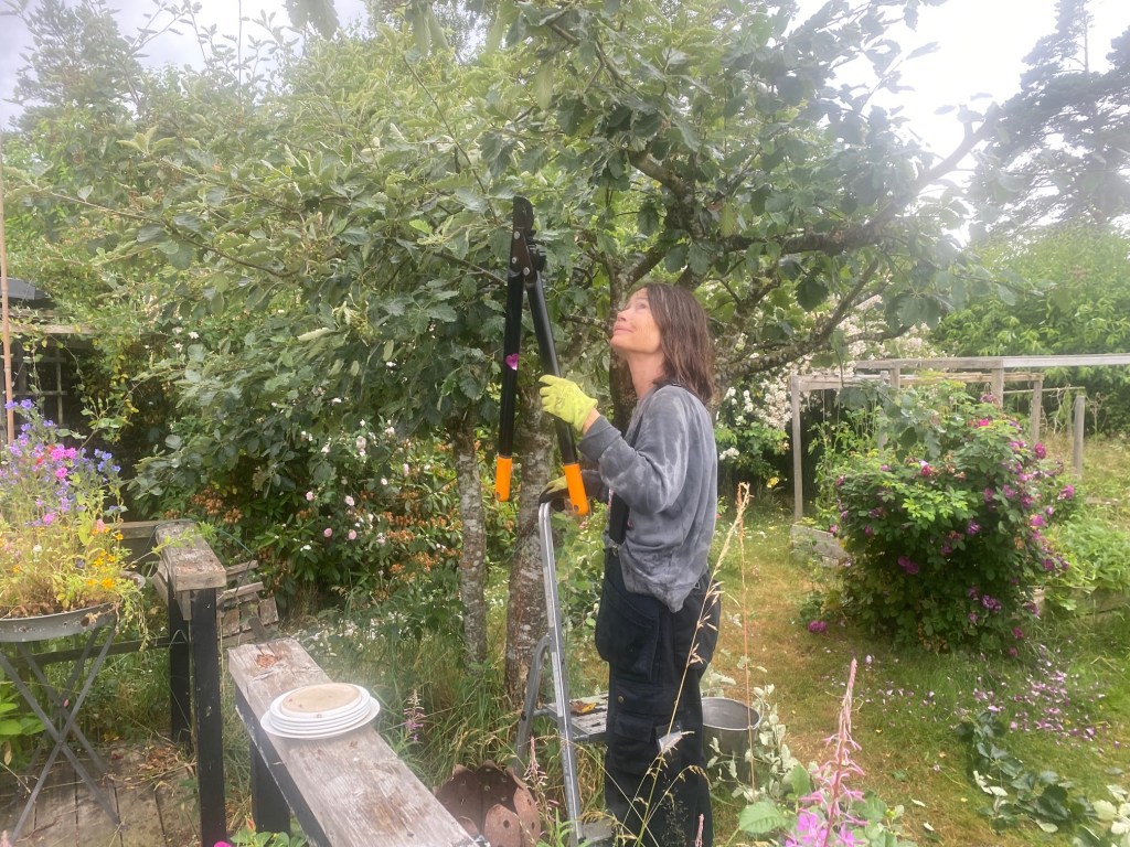 Somliga dagar uppträder mormor och farmor i sina vanliga arbetskläder. Och nu är hon redan igång med att frisera oxeln, pappa Bertils vårdträd. – Som vanligt vacker att se på: