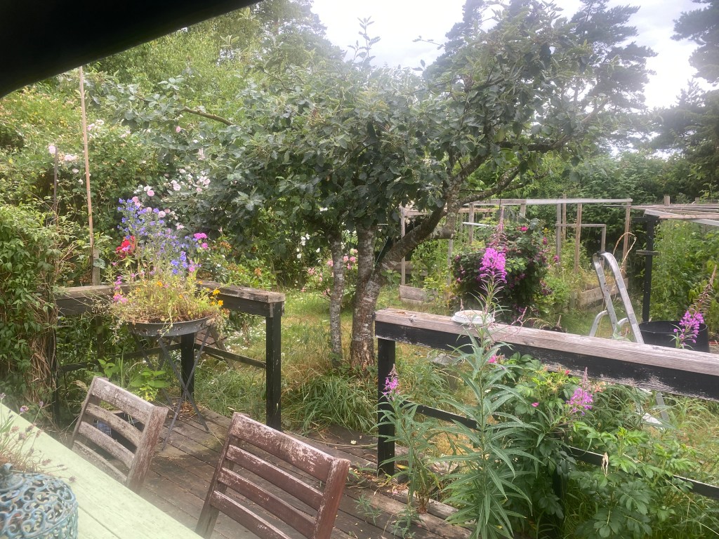 Och vackert blir det. Ljusare och nu ser man till och med rosorna från uteplatsen. – Även under parasollet för nu börjar det dugga ett milt sommarregn …