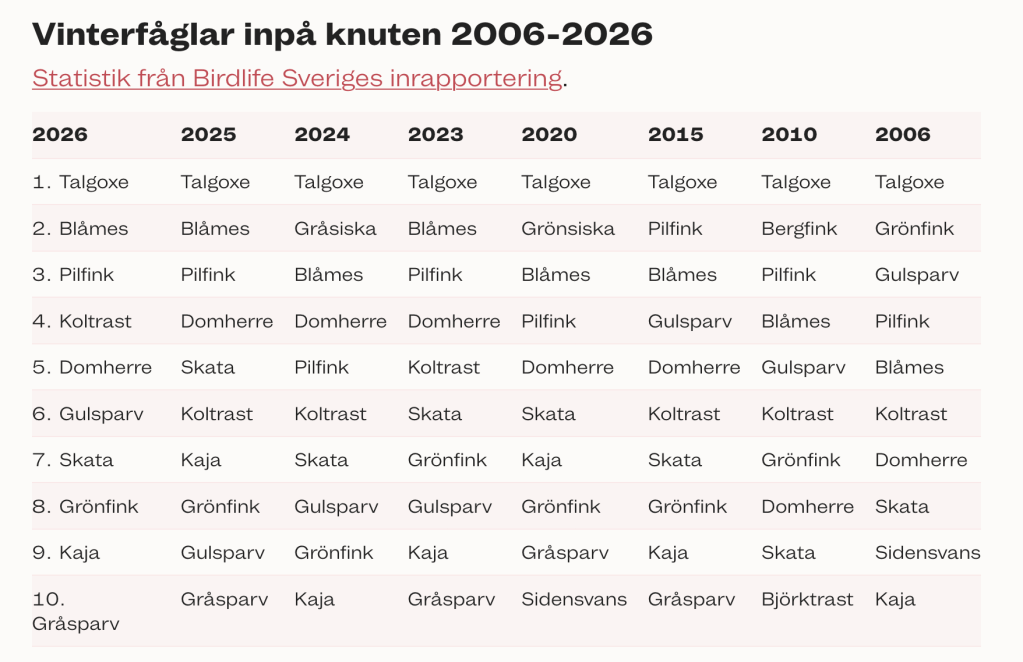 Talgoxarna toppar vår närvarolista. Liksom tidigare år. Däremot: 2024 toppade blåmesen vår lista tillsammans med talgoxen, men blåmesen lyser ännu med sin frånvaro.